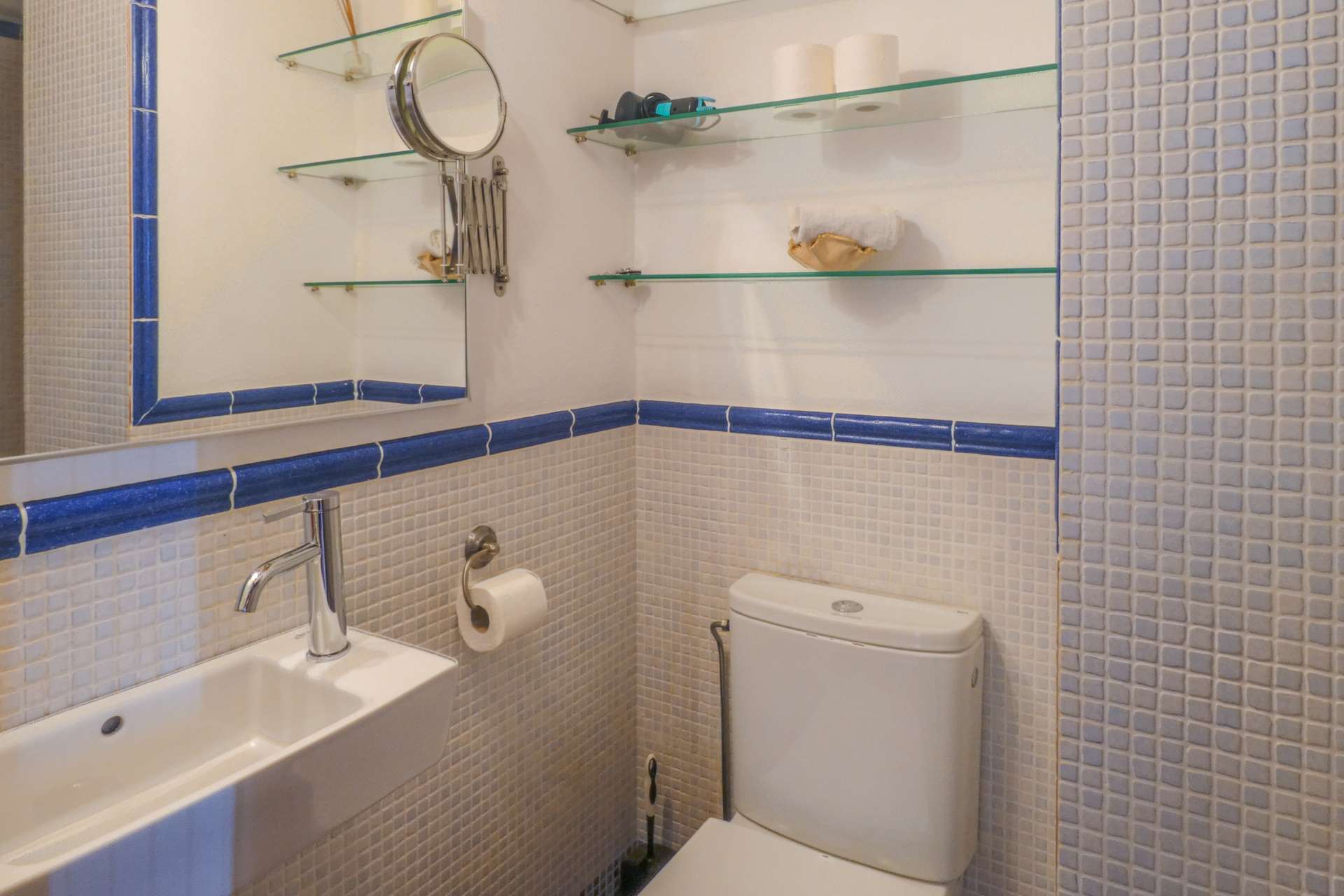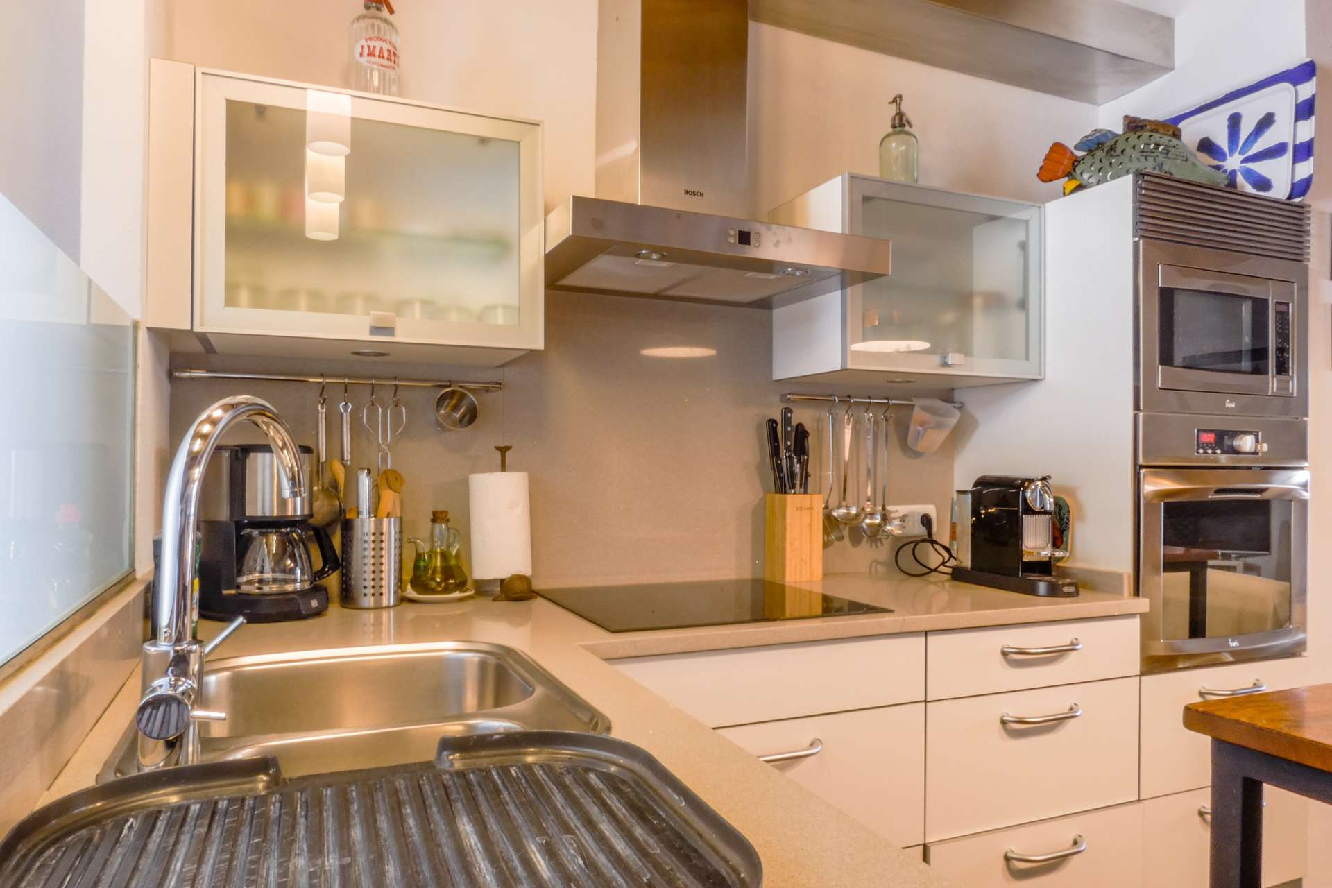Consta de 120 m2 útiles distribuidos en tres plantas. En la planta baja se encuentra el amplio salón/comedor, con cocina integrada. La luminosa cocina está equipada con cocina de inducción, horno, nevera-congelador, lavavajillas, microondas, cafetera Nespresso, y espacio para reciclaje. El comedor tiene una mesa para las comidas familiares y proporciona la conexión con la zona de estar. En la Sala se encuentran dos sofás y una chimenea. Además de una smart TV con conexión vía satélite Astra.