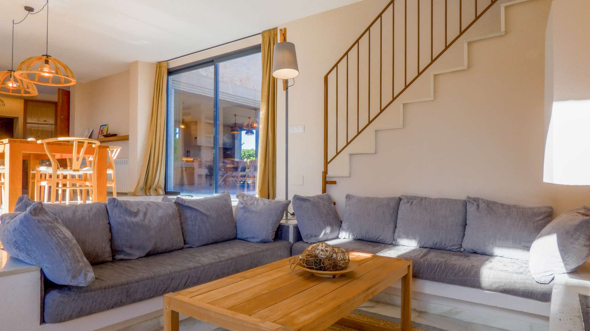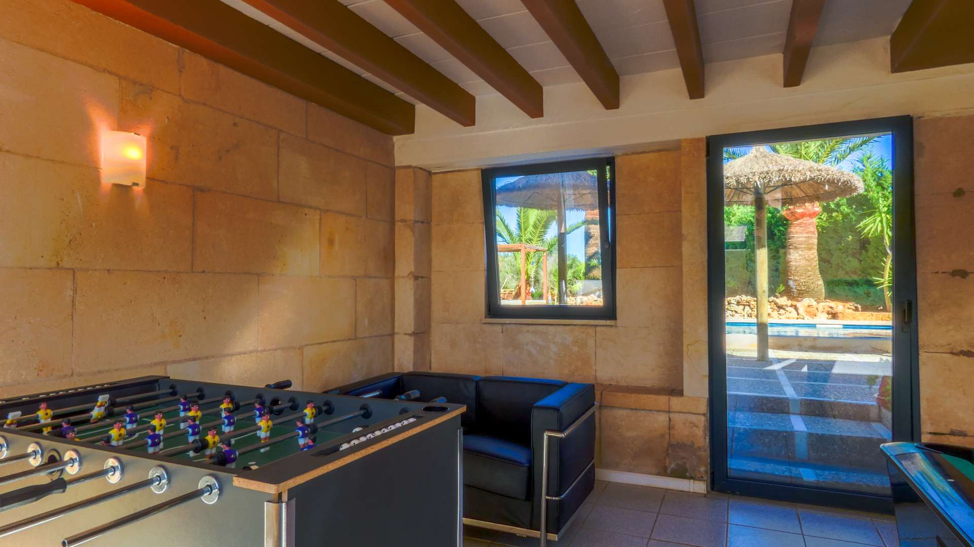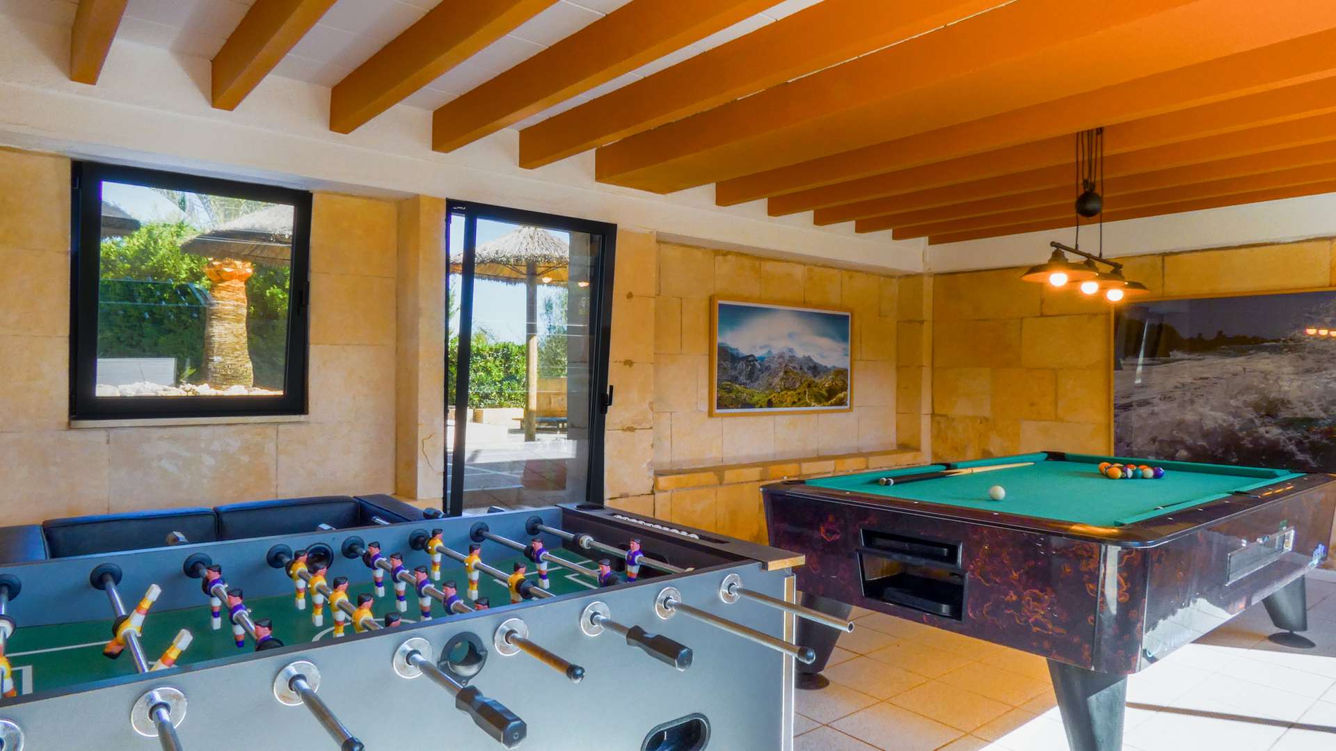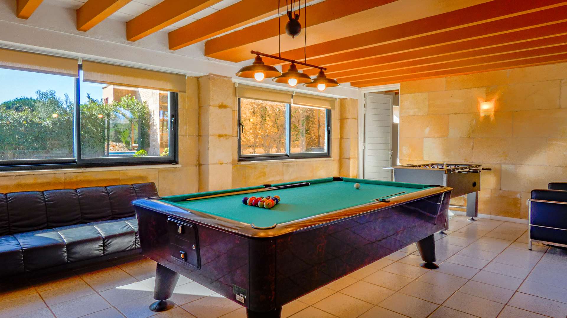 La casa también cuenta con varios espacios de ocio interior, entre ellos una sala de juegos con billar y futbolín, una sala biblioteca con televisión y un mirador interior desde el que se pueden contemplar vistas al mar y al archipiélago de Cabrera.