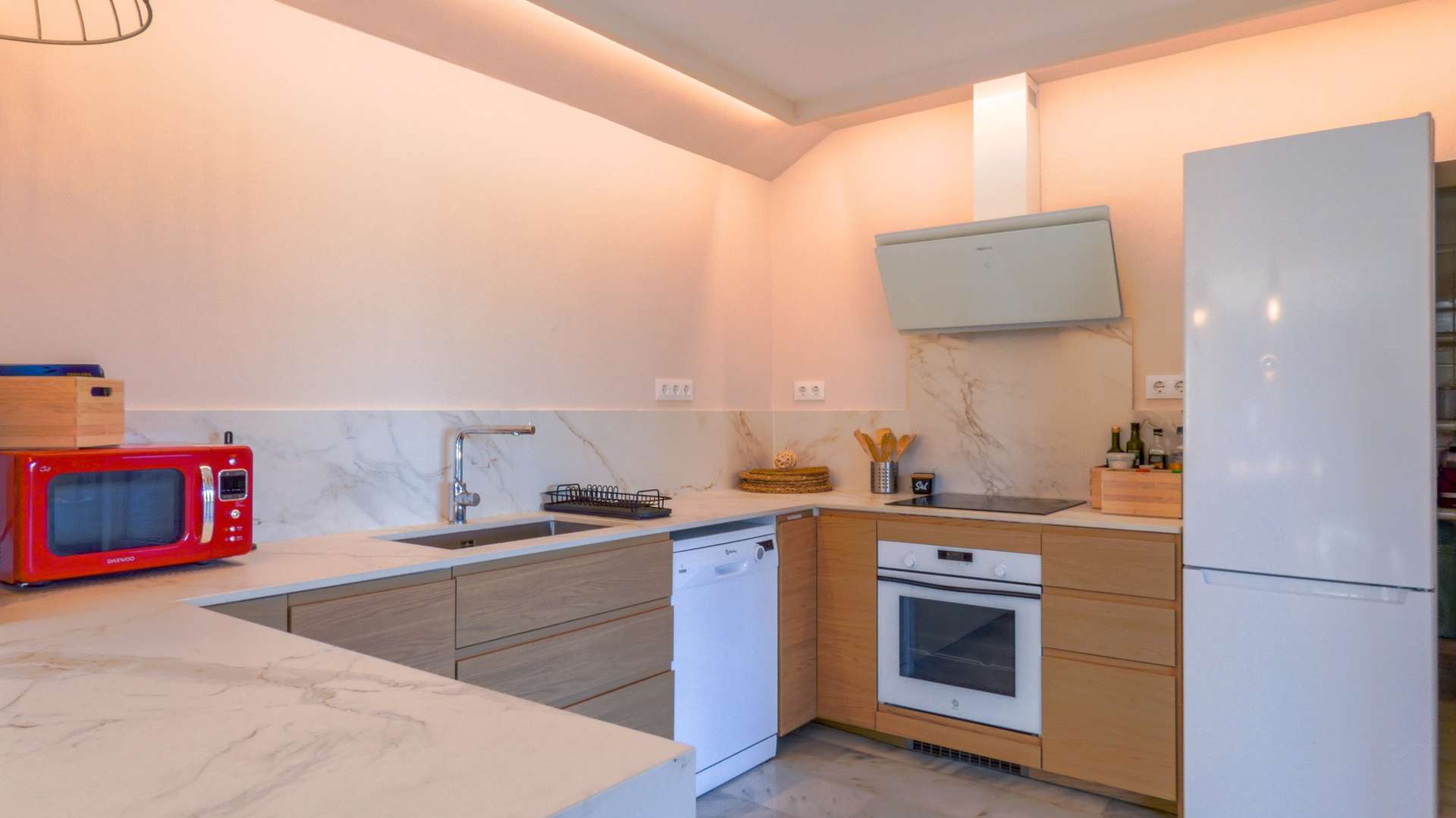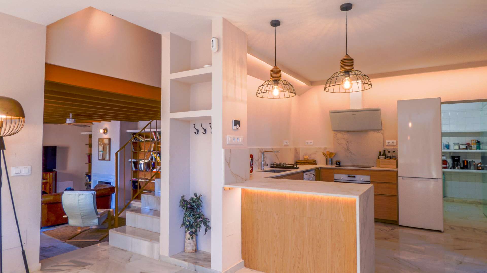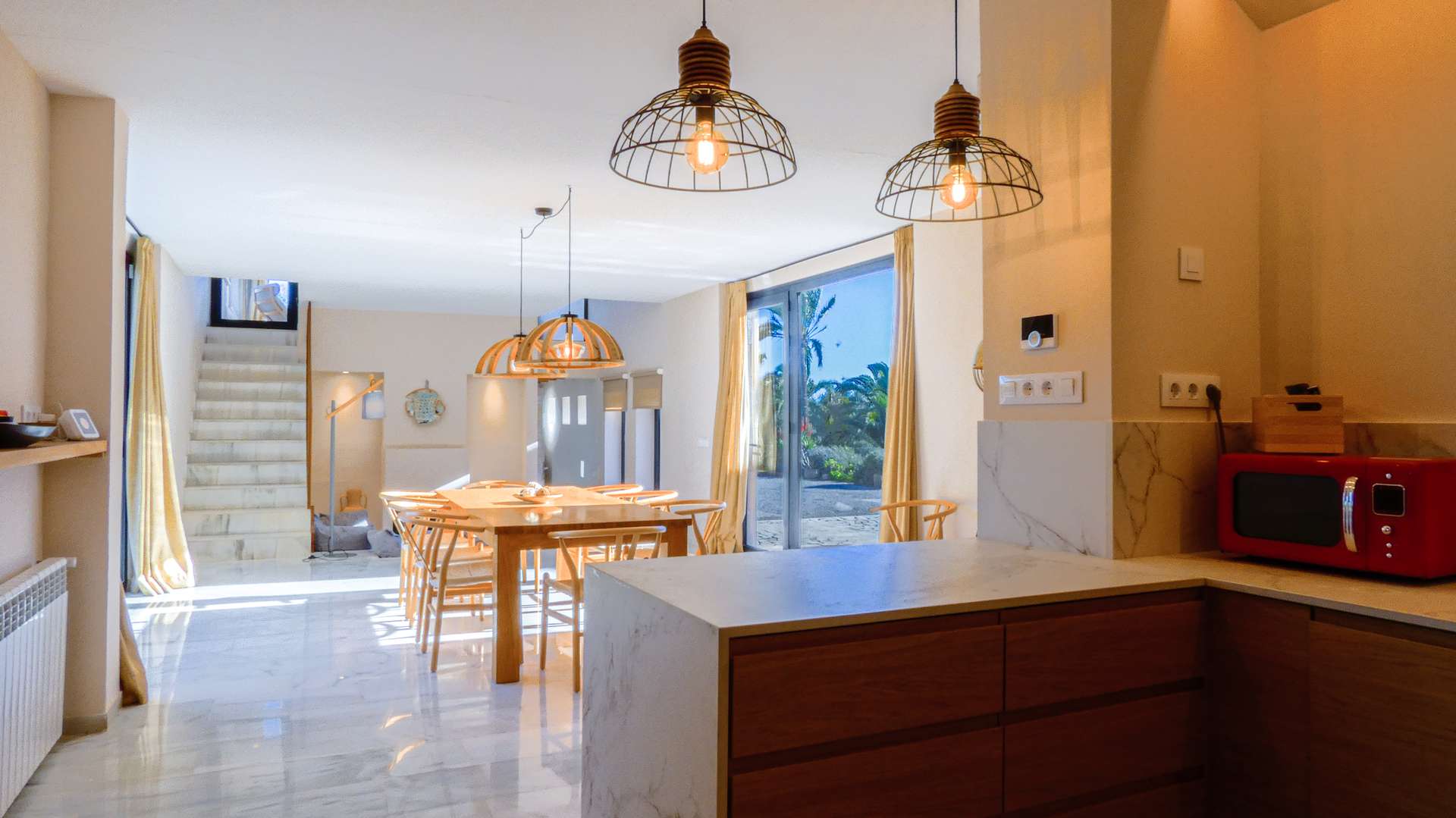 Con aproximadamente 280 m² de superficie útil, la casa ofrece espacios amplios y luminosos, diseñados para disfrutar tanto del interior como del exterior. La cocina, totalmente equipada, se integra con el comedor y facilita un ambiente cómodo para compartir comidas y momentos en grupo.